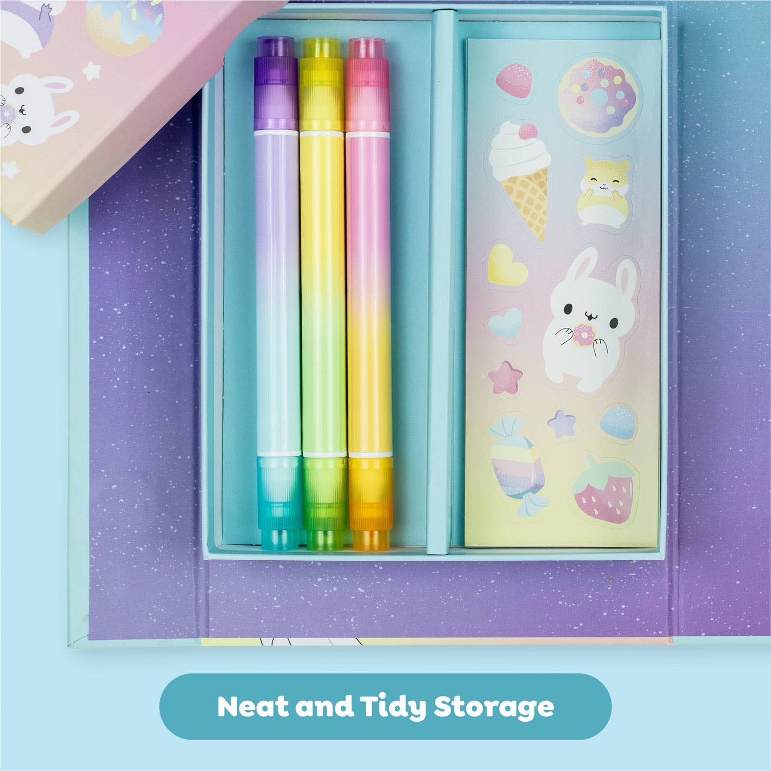 Tasty treats, cute cafes and kawaii creatures all combine for creative kids to transform into a magic world of soft-hued sweetness double-ended pastel markers. Includes 3 double ended pastel markers (6 colors) Complete in our sturdy, magnetic-sealed case perfect for kids on the go.