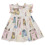 A storybook style brought to life through an exclusive artist collaboration with Tara Gill! This charming dress showcases illustrated castles and whimsical characters, finished with romantic ruffles and luxe pink velvet trim for a truly magical spring silhouette.