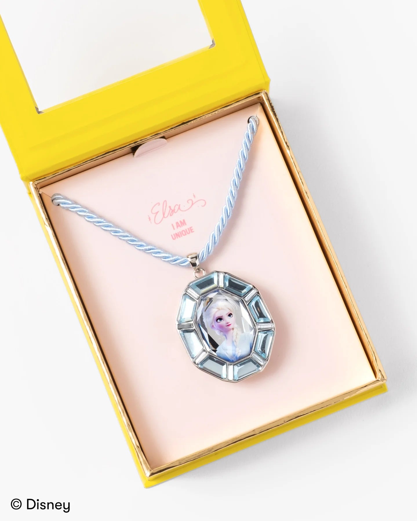 Designed to celebrate your unique spirit, this enchanting accessory features an icy blue rope cord and a dazzling crystal locket pendant showcasing Elsa's radiant face. Open the locket to reveal a mirror and the empowering affirmation, 'I Am Unique’—a reminder to embrace your individuality with confidence and pride!