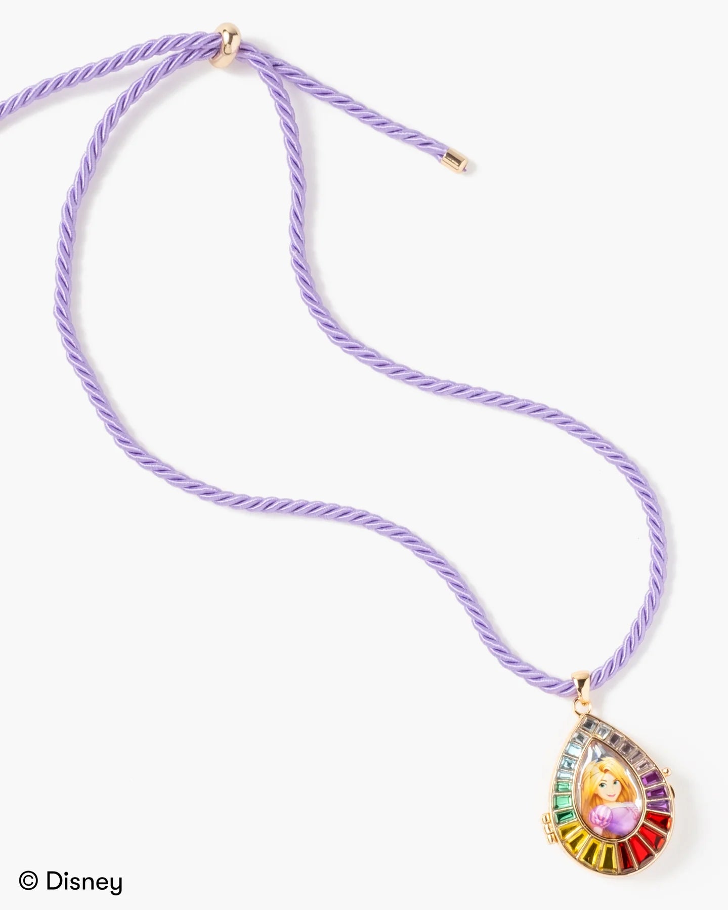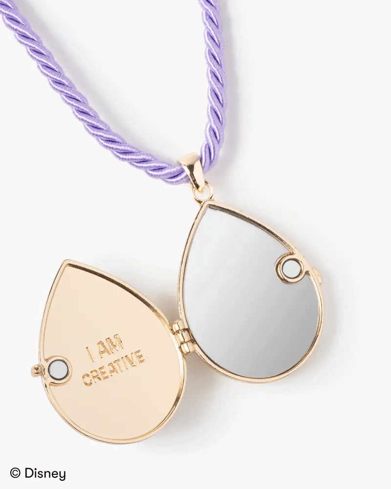 Designed to inspire creativity in young hearts, this enchanting accessory features a vibrant purple adjustable rope cord and a dazzling gem pendant showcasing Rapunzel's radiant face. Opening to reveal a mirror and the empowering message: 'I Am Creative,' it encourages kids to embrace their unique abilities and express themselves fearlessly.