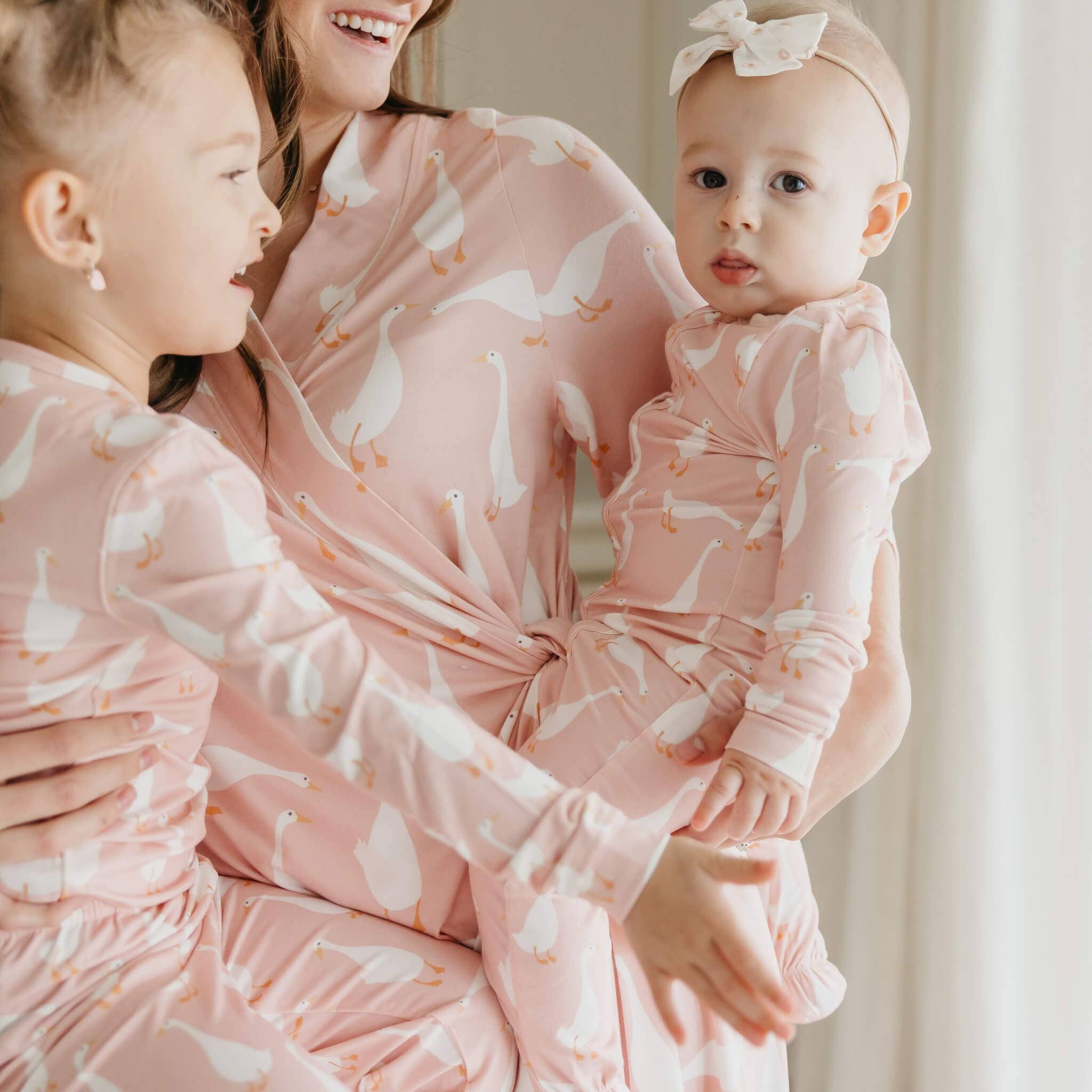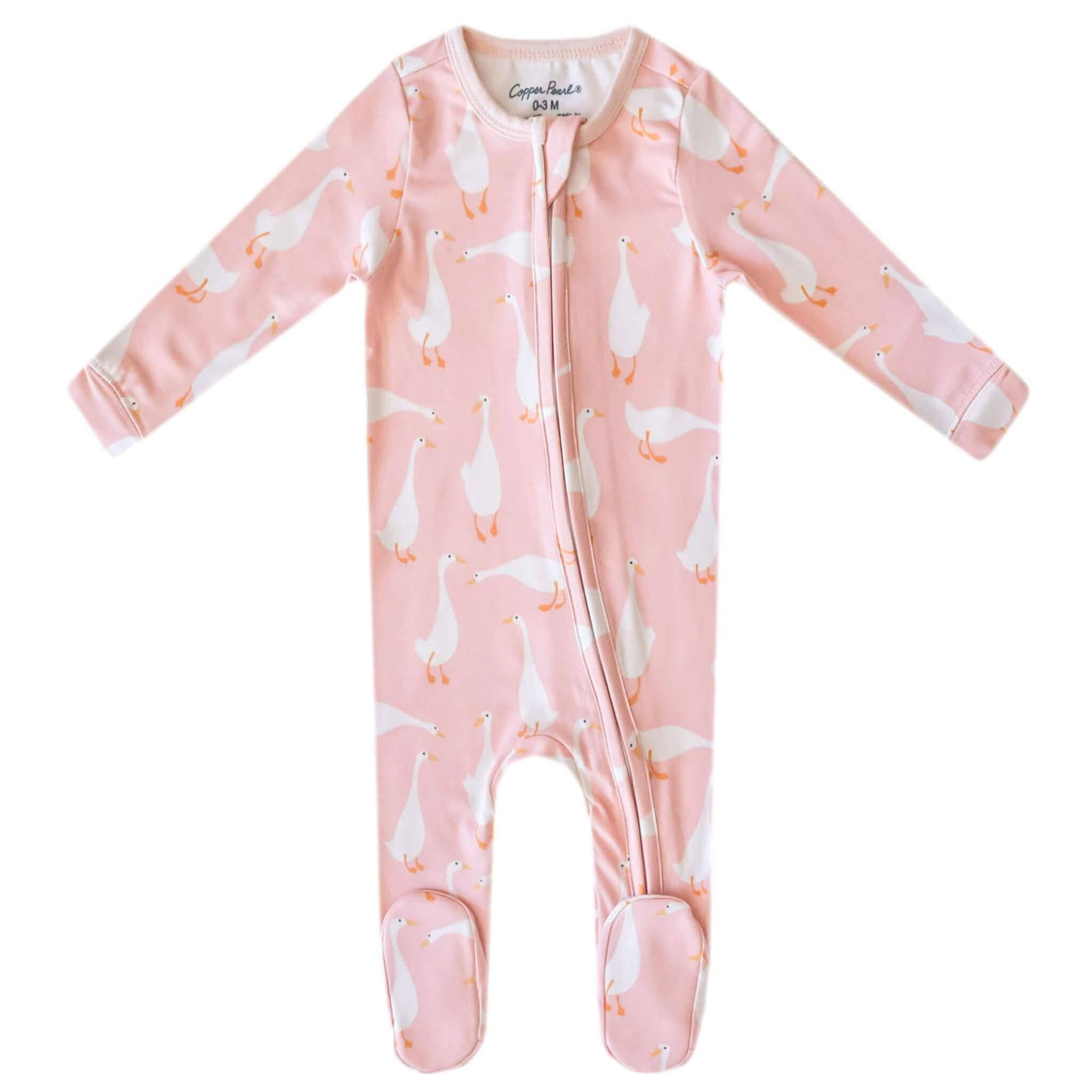 Classic footie pajamas in the sweetest goose print! These are the perfect footie pajamas, featuring buttery soft fabric, a tag-free design, and a two-way zipper for easy changing.