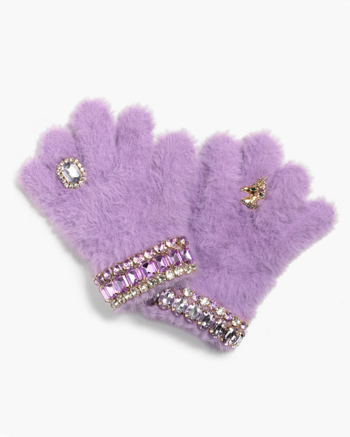 Snuggle up in style with the Lavender Dreams Jeweled Gloves! These super soft, lavender-hued gloves keep little hands warm while adding a big dose of sparkle. Featuring pearly beads, pastel gems, and mini unicorn charms designed to look like built-in rings and bracelets, they’re the coziest way to glam up any cold-weather outfit.
