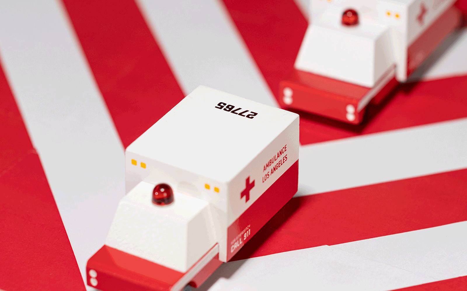 If you're a movie buff, you know LA features prominently in lots of tough screenplays. When make-believe play happens, a tiny LA County rescuer is precisely what's needed to keep all the characters in good health. Tiny silver blanket accessories sold separately. Materials: Solid Beech Wood, water-based paint and clear urethane coat. ABS plastic wheels. Safety tested according to US CPSIA and European, Australian and New Zealand regulations. Not for children under 3 years of age. Dimensions: 3.3" L x 1.6" W x 2.6" H (8.4cm L x 4.1cm W x 6.6cm H) Weight: 6 oz/ 232g Packaging: 3.7" L x 1.7" W x 3.7" H (9.4cm L x 4.3cm W x 9.4cm H)