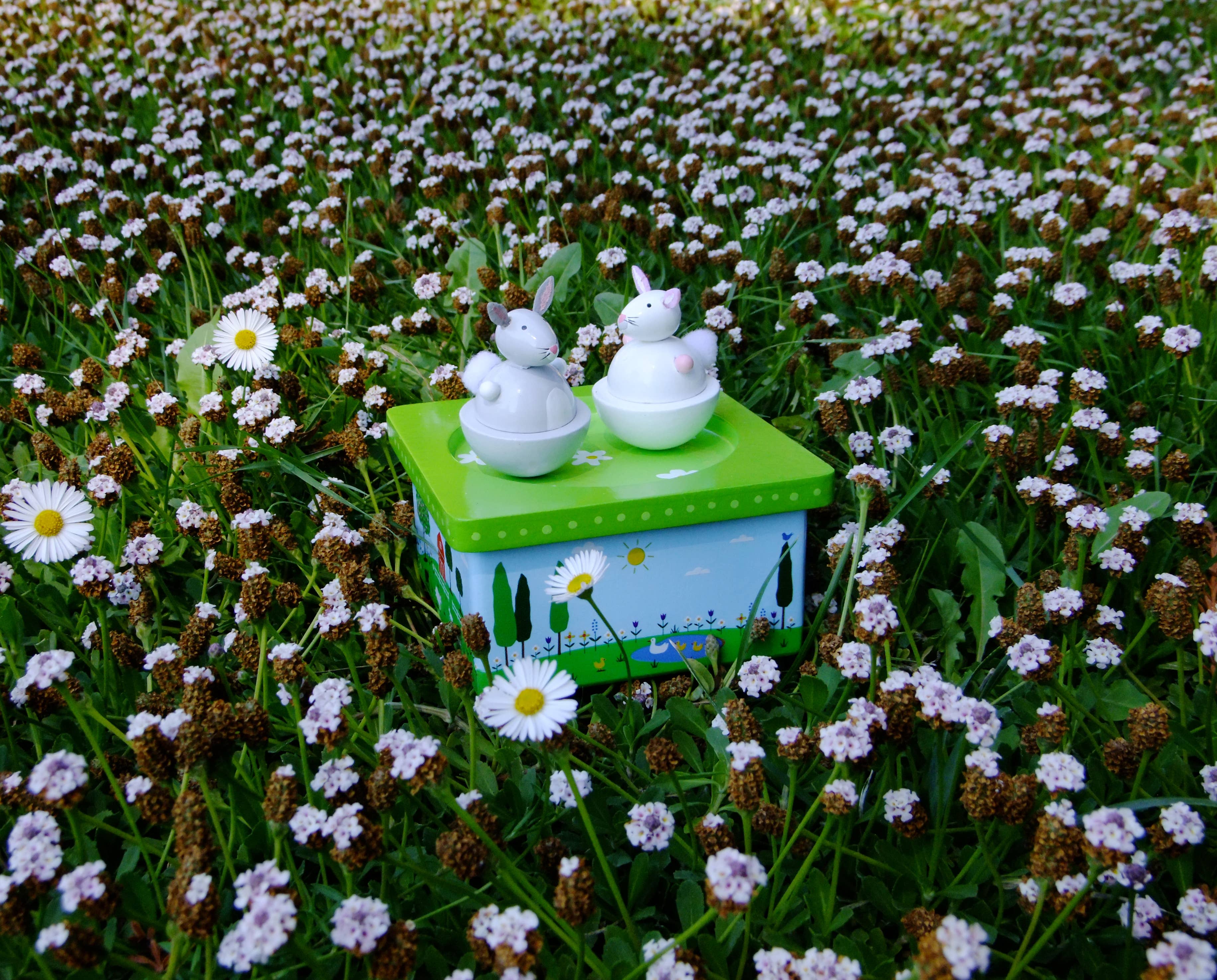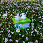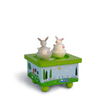 These new music boxes are truly magical. Based on a classic design, wind the key on the bottom of the box, place on a flat surface, then watch the sweet little bunnies twirl around and dance to the tune of "Here Comes Peter Cottontail".