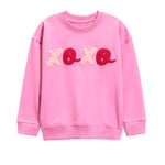 This pink crewneck sweatshirt features a charming xoxo applique for a fun touch. Designed with ribbed cuffs and a snug hem, it delivers a cozy fit that keeps her warm and comfy. This girls sweatshirt's relaxed shape makes it ideal for layering over tees or under jackets, perfect for playdates, school, or weekend fun.