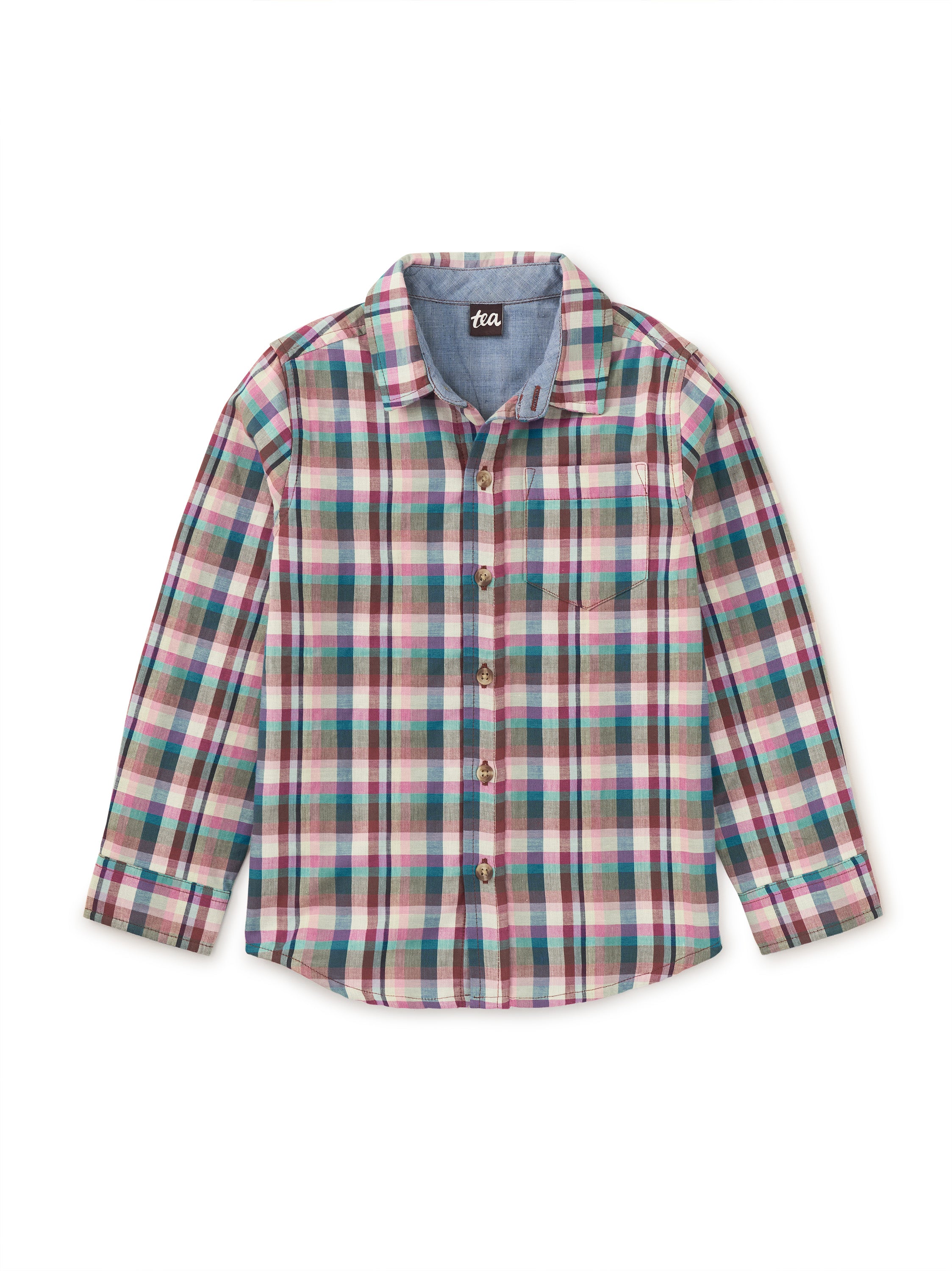 This standard fit Tea Collection plaid button up is perfect for fall weather. Long sleeve, thigh length, button closure.