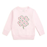 This darling pink sweatshirt features a large, charming four-leaf clover patch filled with a playful pattern of tiny shamrocks, pink bows, and golden horseshoes, making it the sweetest look for St. Patrick's Day fun!