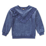 This velour ruffle tunic adds instant polish with its soft shine and charming V-shaped ruffle detail. Designed with an easy fit, drop shoulders, and extra-long sleeves, it's a cozy yet elevated choice for school days, holidays, and everything in between. Pair it with our velour flare pants for a head-to-toe look that feels both comfy and dressy.